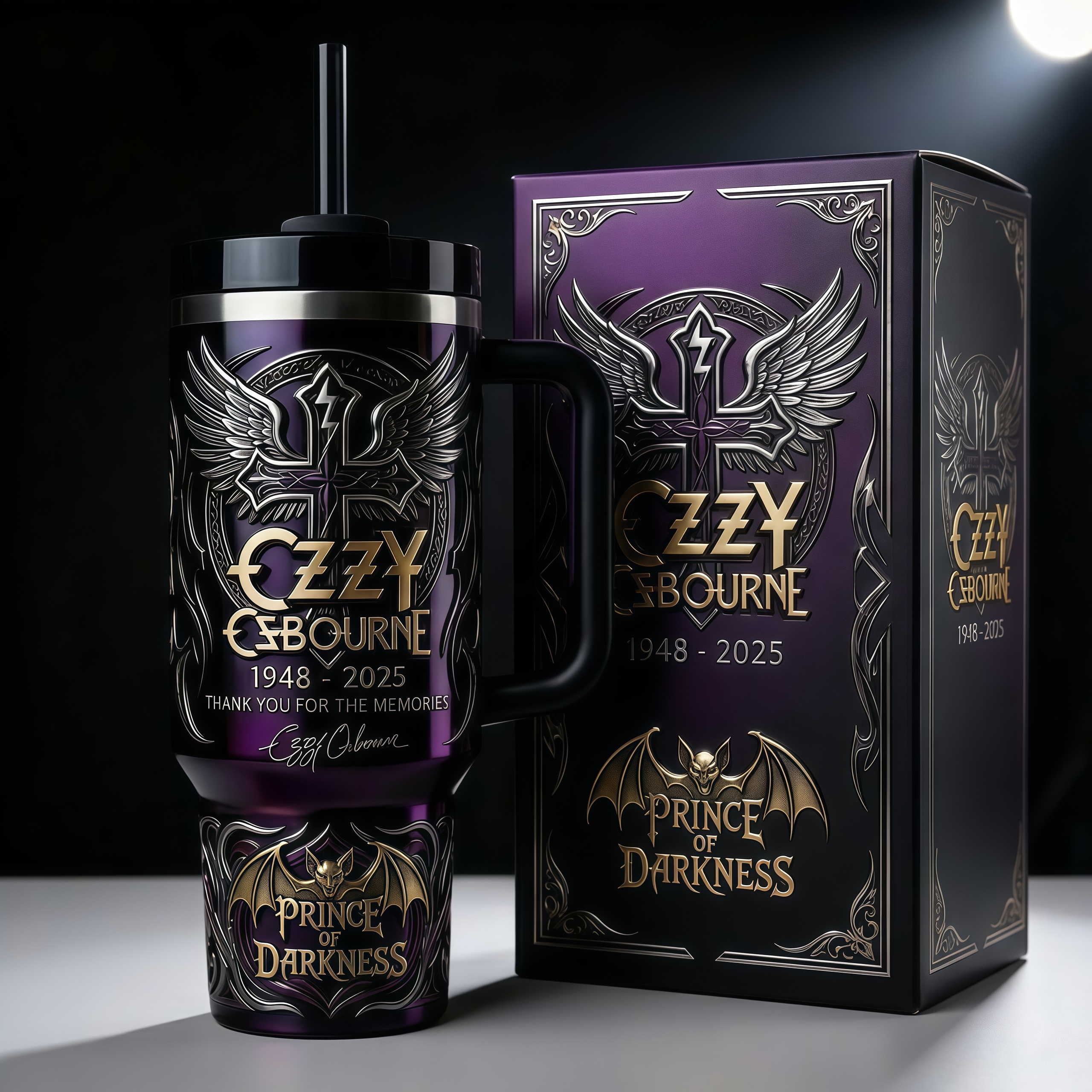 🦇🖤Unleash the eternal spirit of heavy metal and pay the ultimate homage to the icon of icons with the exclusive Ozzy Osbourne "Prince of Darkness" Memorial Stanley Tumbler, a breathtaking masterpiece meticulously designed for the fans who lived through every legendary riff and every moment of rock 'n' roll madness.